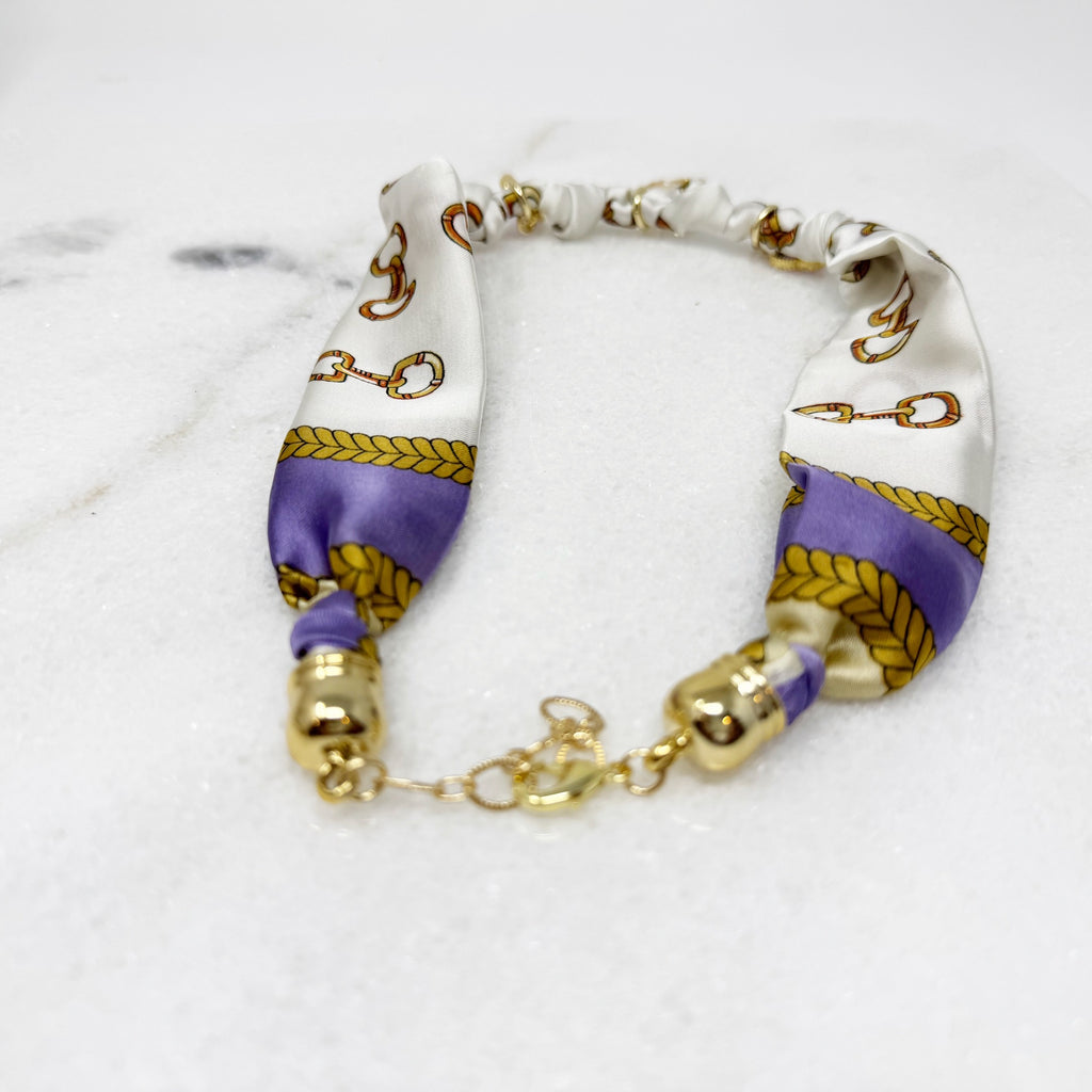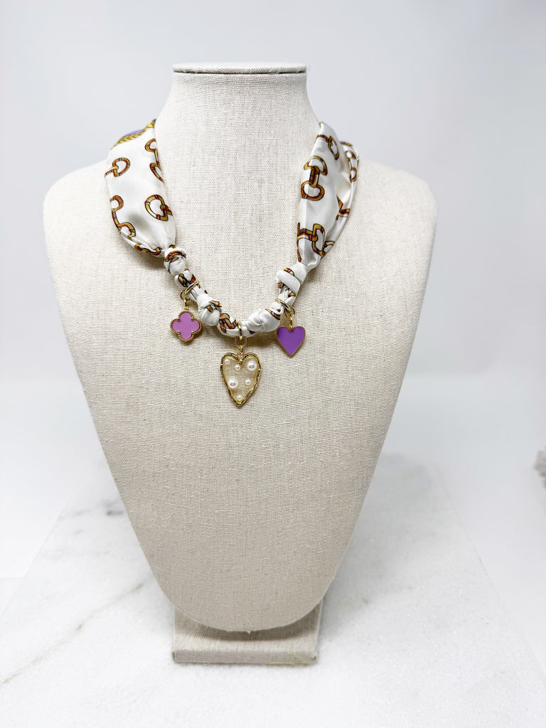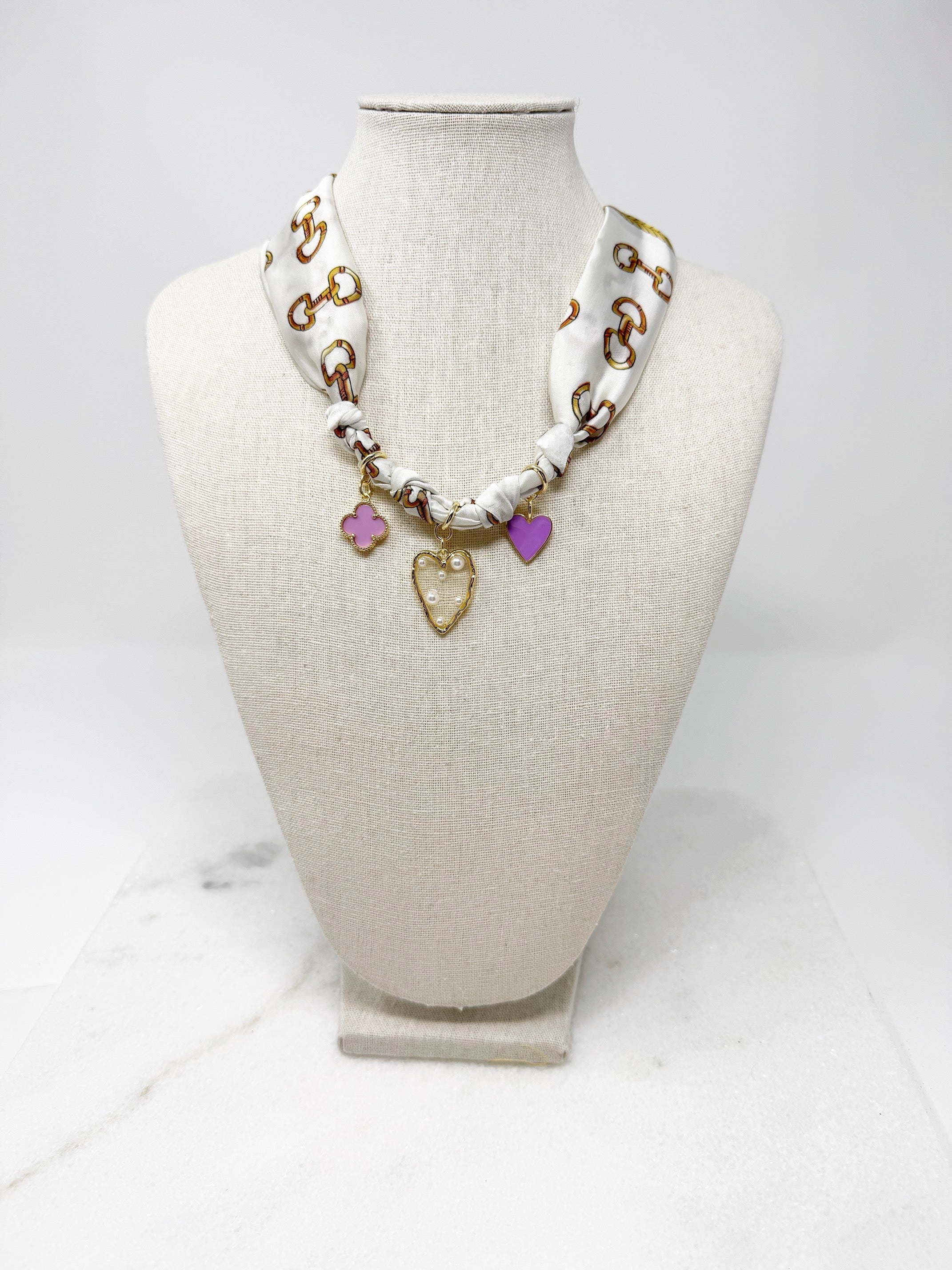 We love this beautiful scarf print, each necklace varies were print is placed. Golden horse bit with lavender print is accented with a gold and lavender heart charm, pearl heart charm and a lavender Quatrefoil.